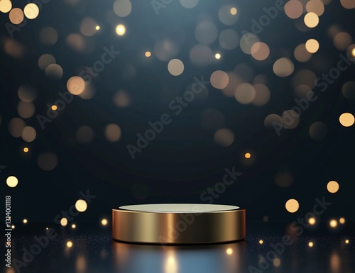 Minimal abstract background with a gold podium for product presentation, mock-up, and display of goods on a dark background with bokeh lights, a scene for advertising products or services.