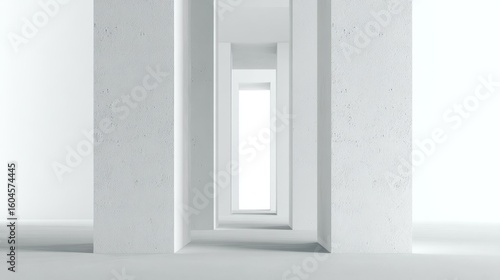 Minimal abstract white interior with clean empty space, smooth white walls, modern architecture elements, and soft ambient lighting. 3D rendering for contemporary design, concept, or visualization use