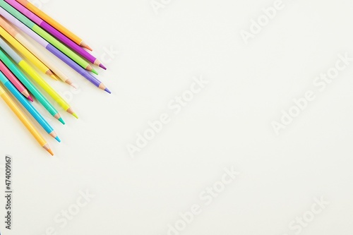 Minimal creative composition on white background with colorful pencils, art, drawing, creativity, design concept, space for text or product.