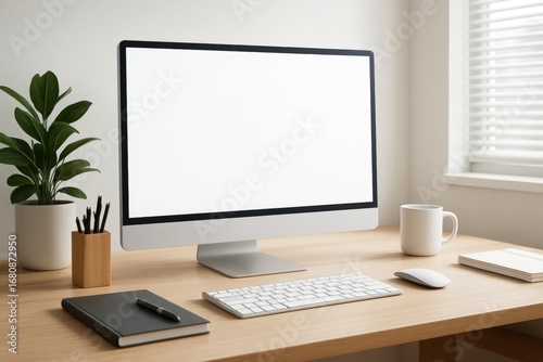Minimal desktop workspace with blank computer screen, keyboard, notebook, and coffee mug on wooden desk in bright room with clean layout. Ai generative