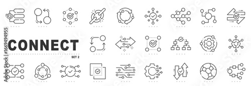 Minimal line icons illustrating connect, network, sync, workflow, integration, transfer, hierarchy, flowchart, automation, global communication, hub nodes, editable stroke, diagram