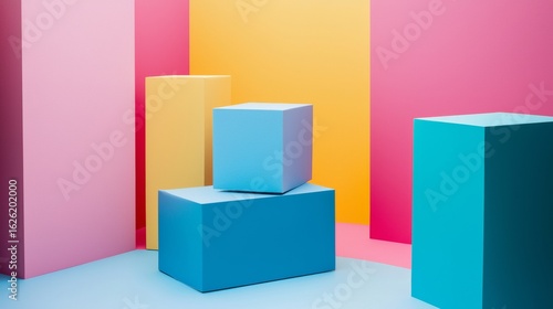 Minimal pastel geometric cubes on blue pink background for abstract design branding layout modern 3D composition illustration visuals