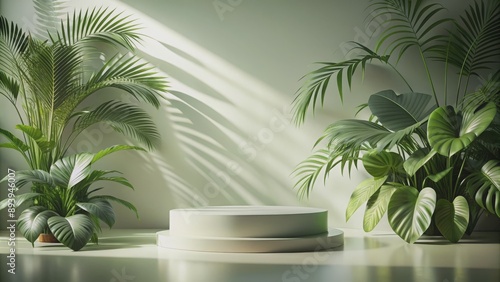 Minimal render of podium with tropical leaves and soft summer lighting, podium, minimal, render, tropical, leaves, soft, summer