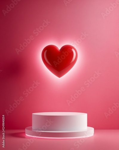 Minimal romantic scene with empty pedestal and a heart-shaped sculpture in pink and red colors. 3D rendered interior with podium in center, vertical banner for Valentine's Day promo or Wedding card.