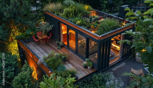 Minimal shipping container cabin in an urban rooftop garden, clean lines and sustainable materials creating a tranquil oasis