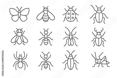 Minimal thin line icon set of insects and arachnids: butterfly, bee, ladybug, beetle, fly, ant, mosquito, stag beetle, spider. Simple outline vector symbols for app UI and charts