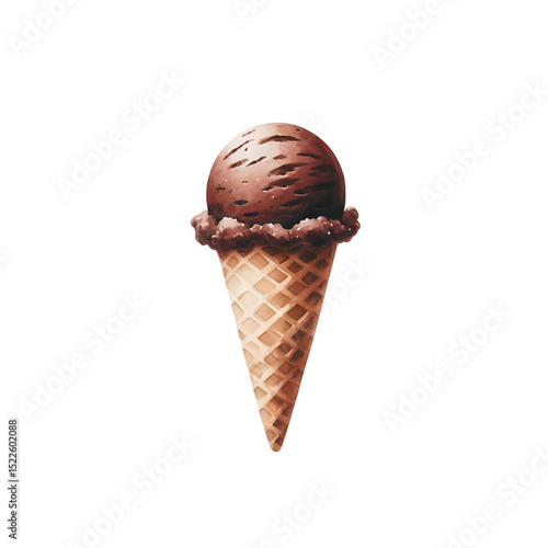 Minimal watercolor art of a single scoop of dark chocolate ice cream in a waffle cone.