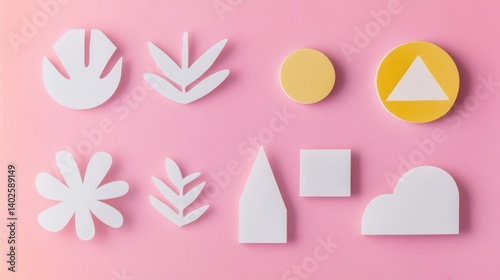 Minimal white sticker shapes arranged on a pastel pink background showcasing simple designs and clean lines in a contemporary style