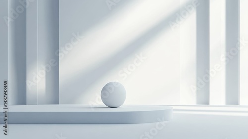 Minimalist 3D render of a light grey sphere on a platform, set against a backdrop of clean white walls and subtle light shadows. : Generative AI
