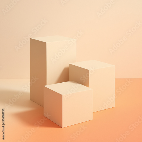 Minimalist 3D Render of Three Beige Geometric Cubes on a Two-Tone Pastel Background - Perfect for Product Display, Presentation, and Abstract Concepts