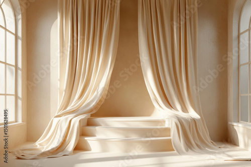 Minimalist 3D rendered scene with beige rectangular podium and draped fabric creating elegant folds