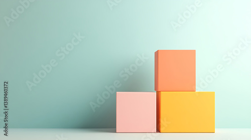 Minimalist 3D rendering of three colorful geometric cubes stacked against pastel blue background, creating modern and clean composition