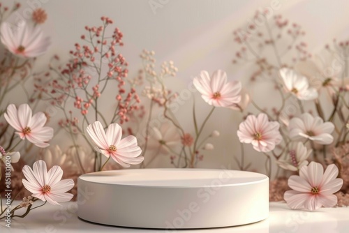 Minimalist 3D round platform with a smooth matte finish, placed against a soft, pastel floral background. The delicate, abstract floral patterns in muted tones create a serene backdrop. Soft,
