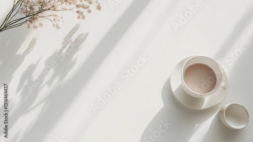 Minimalist aesthetic flat lay A serene tea set with delicate flowers and soft shadows.