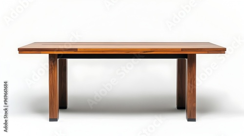 Minimalist and modern rectangular dining table with a sleek wooden top isolated on a clean white background