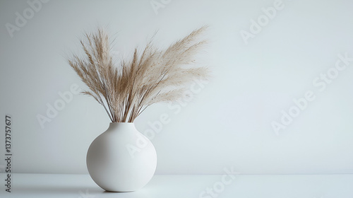 Minimalist arrangement of dried plumes in a white vase on a white surface, clean background, soft light.