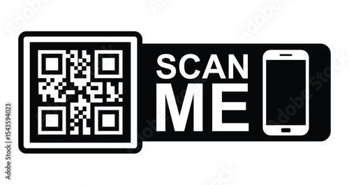 Minimalist black & white graphic: QR code in upper left with focus frame. Large white "SCAN ME" text below/to right. Stylized white smartphone icon lower right.