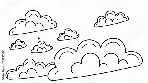 Minimalist black and white cloud illustration with simple outlines and floating fluffy cloud shapes