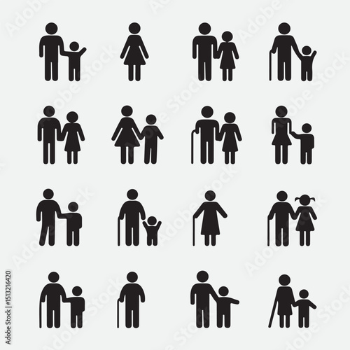 Minimalist black and white icons of diverse family silhouettes in simple square grid layout