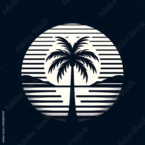 Minimalist black and white illustration of a palm tree at sunset within a circle.
