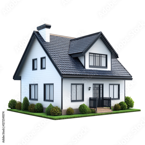 Minimalist black and white modern house with sharp angles and pitched roof isolated on a transparent background