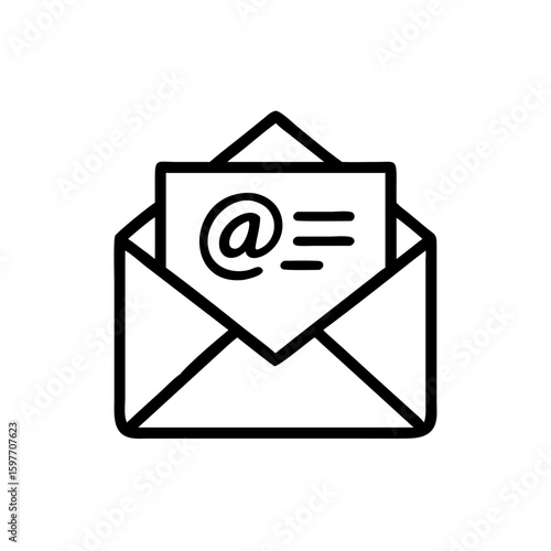 Minimalist black outline vector icon of an open envelope with a paper displaying a bold "@" symbol, representing email, digital communication, and online messaging. Transparent background
