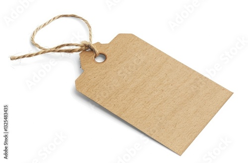 Minimalist blank brown paper tag with string on a white background, isolated and ready for customization.