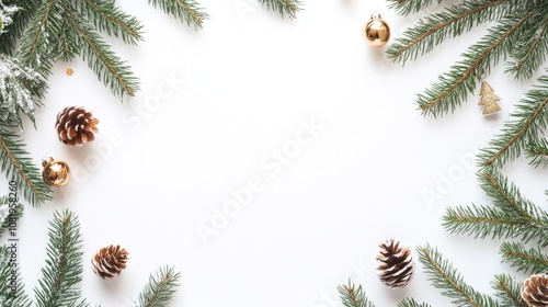 Minimalist blank Christmas card on a white background, with subtle winter-themed decorations like pine branches and tiny ornaments framing the card.