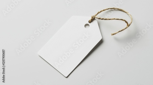 Minimalist blank white paper tag with a string on grey background perfect for design and branding projects.