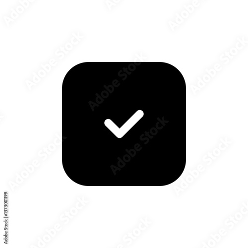 Minimalist checkmark icon inside a solid black square. Symbol of approval, success, or task completion. Clean vector illustration for web design, app interface, and graphic design projects
