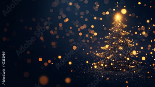 Minimalist Christmas tree design made from golden lights on a dark background. Modern holiday theme with space for festive greetings, ideal for banners and online ads. Copyspace.