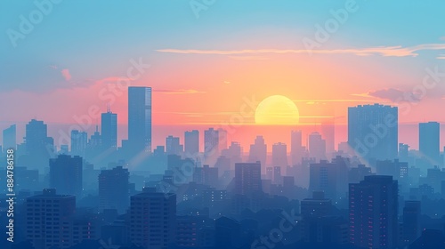 Minimalist Cityscape at Sunrise with Geometric Shapes and Calm Color Palette