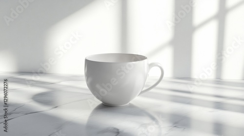 Minimalist coffee cup on marble table with window light and shadow