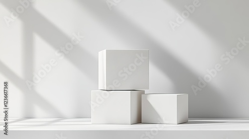 Minimalist Composition Featuring Three White Boxes Neatly Arranged on a Sleek Shelf in Front of a Bright White Wall Creating a Clean and Modern Aesthetic in a Contemporary Space