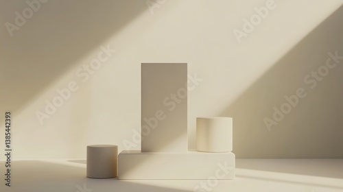 Minimalist cream-colored display podiums, sunlit studio background, product showcase
