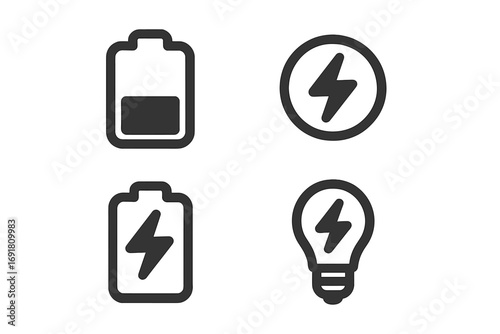 Minimalist dark mode icon set. Battery level and charging status symbols. Energy and power concept vector illustration. Electricity, bolt, and lightbulb signs for UI UX design.