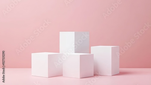 Minimalist design featuring three white cube podiums on a pink pastel backdrop. Perfect for product presentation and 3D rendering technical concepts.