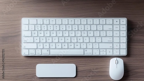 Minimalist desktop setup featuring a white mechanical keyboard, minimal mousepad, and a wireless mouse, highlighting modern technology