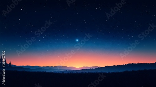Minimalist digital art piece depicting a tranquil night sky illuminated by stars over a distant mountain range at twilight