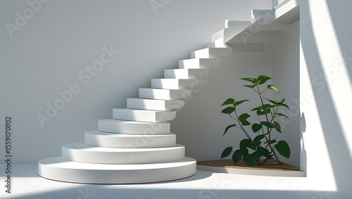 Minimalist Digital Illustration of White Circular Staircase with Green Plant – Clean Modern Design