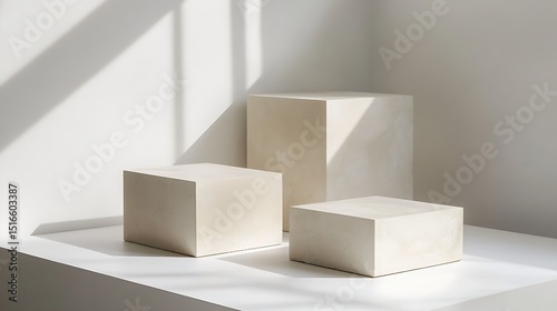 Minimalist display arrangement featuring geometric shapes and soft lighting, presenting a clean and contemporary aesthetic.
