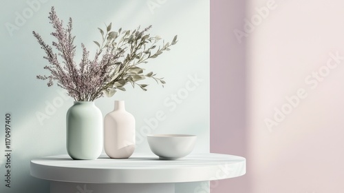 Minimalist display of echoed shapes with muted mint and soft pink accents creating a serene interior atmosphere