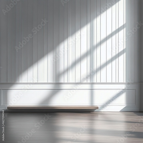 Minimalist empty room with white vertical panel walls, soft natural sunlight casting shadows, and a floating wooden shelf above a polished dark floor