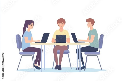 Minimalist flat illustration of three people sitting at a table in an office, working on laptops and having a team meeting against a white background Generative AI