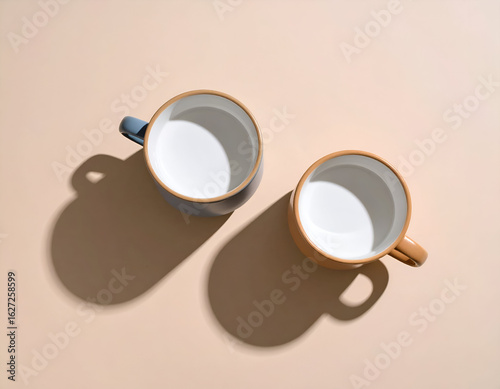 Minimalist flat lay of two empty ceramic cups on a pastel beige background with strong, defined morning light shadows.