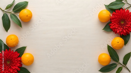 Minimalist flatlay composition with fresh oranges, green leaves, and vibrant red flowers on light wooden background with copy space