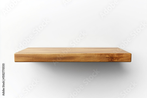 Minimalist floating shelf displaying a rustic wood texture against a clean, bright white background, ideal for showcasing product placement.