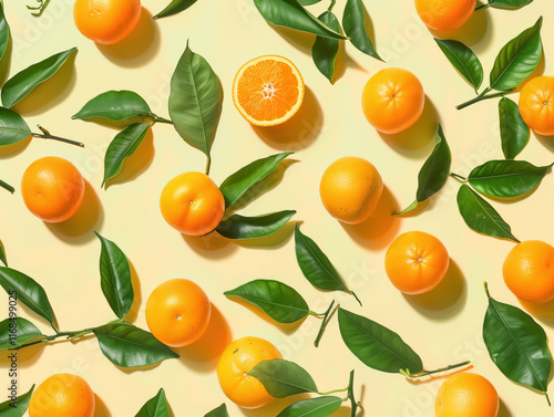 Minimalist fruit of oranges & green leaves on a soft yellow backdrop, perfect for summer design. Refreshing & vibrant flat lay image adds a touch of nature to any project.