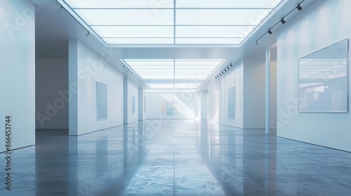 Minimalist gallery hallway with white walls and polished concrete floors. Modern art gallery interior design. Empty space and artwork.