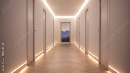 Minimalist hallway design featuring soft led accents modern home interior architecture cozy environment straight-on view tranquility